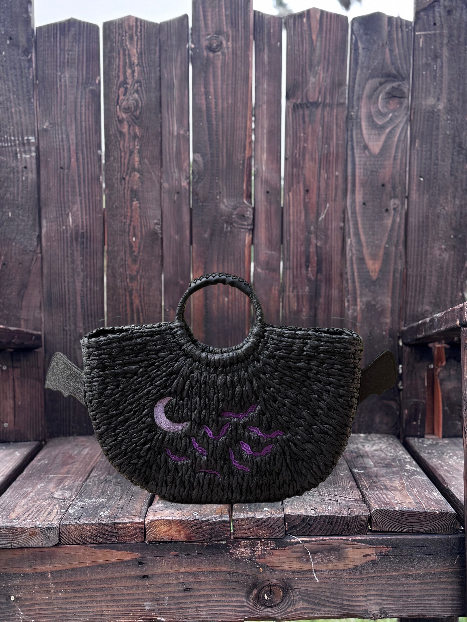 Fly into spooky season early with our Batty for Summerween Bag—a fang-tastically fun accessory made for moonlit beach nights and haunted summer days. Handwoven from durable black dense paper straw, this playful bat bag features oversized felt wings, a sweet embroidered face (fangs and all!), and a back panel with a moonlit sky full of flying bats.