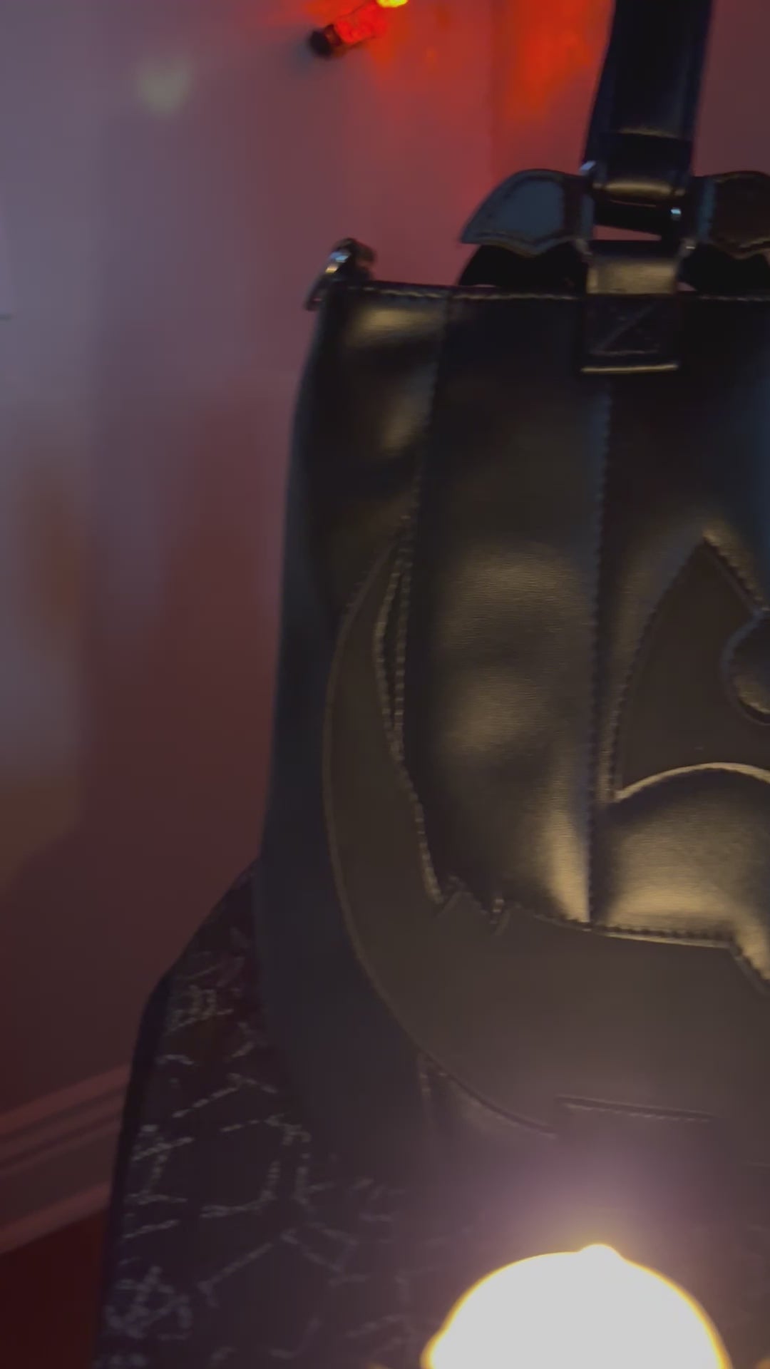 The exterior features a black suede jack-o-lantern face on one side and a spooky, elegant black spiderweb on the other, with small bat wings under the strap for an extra touch of Halloween-inspired charm.