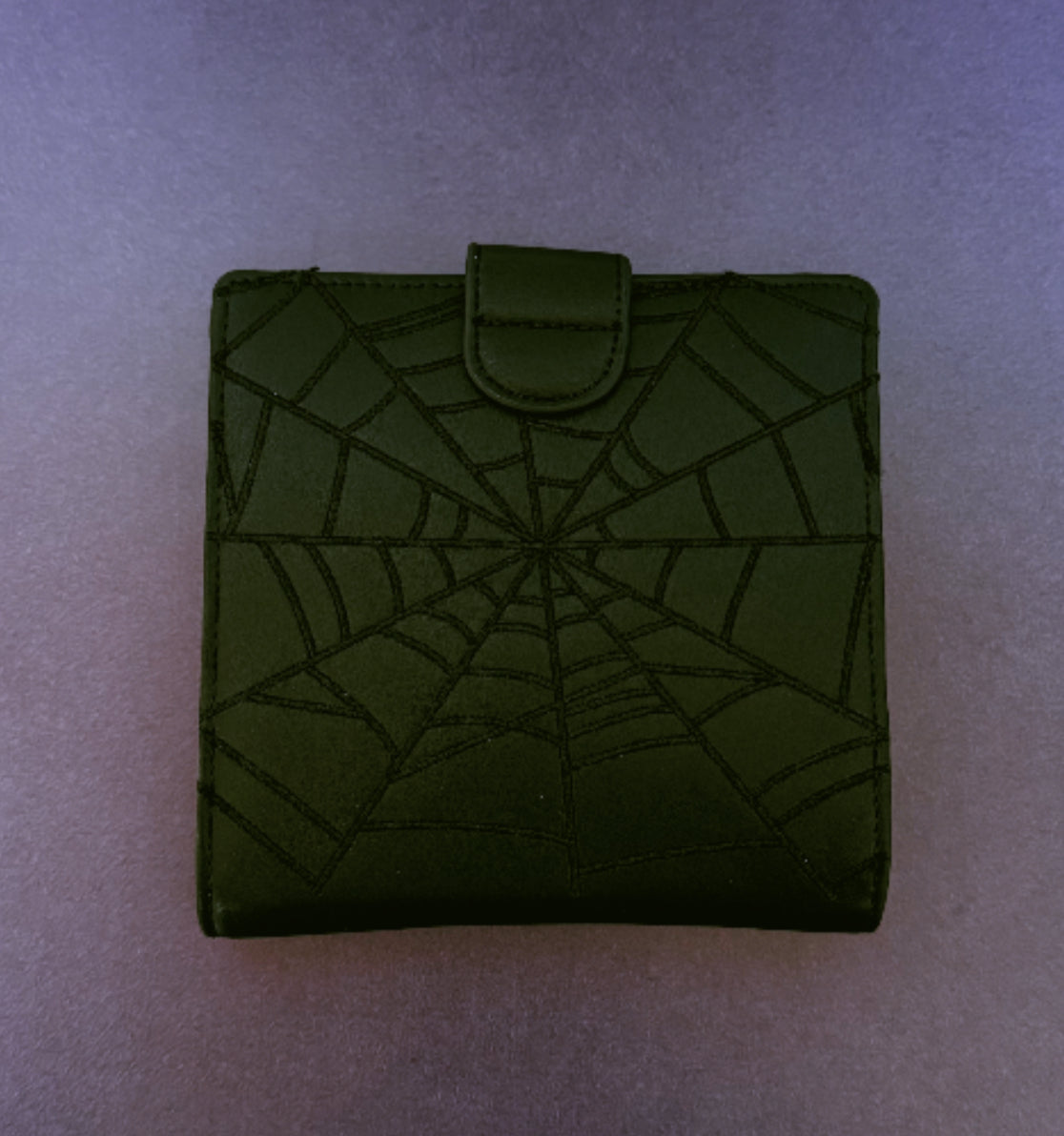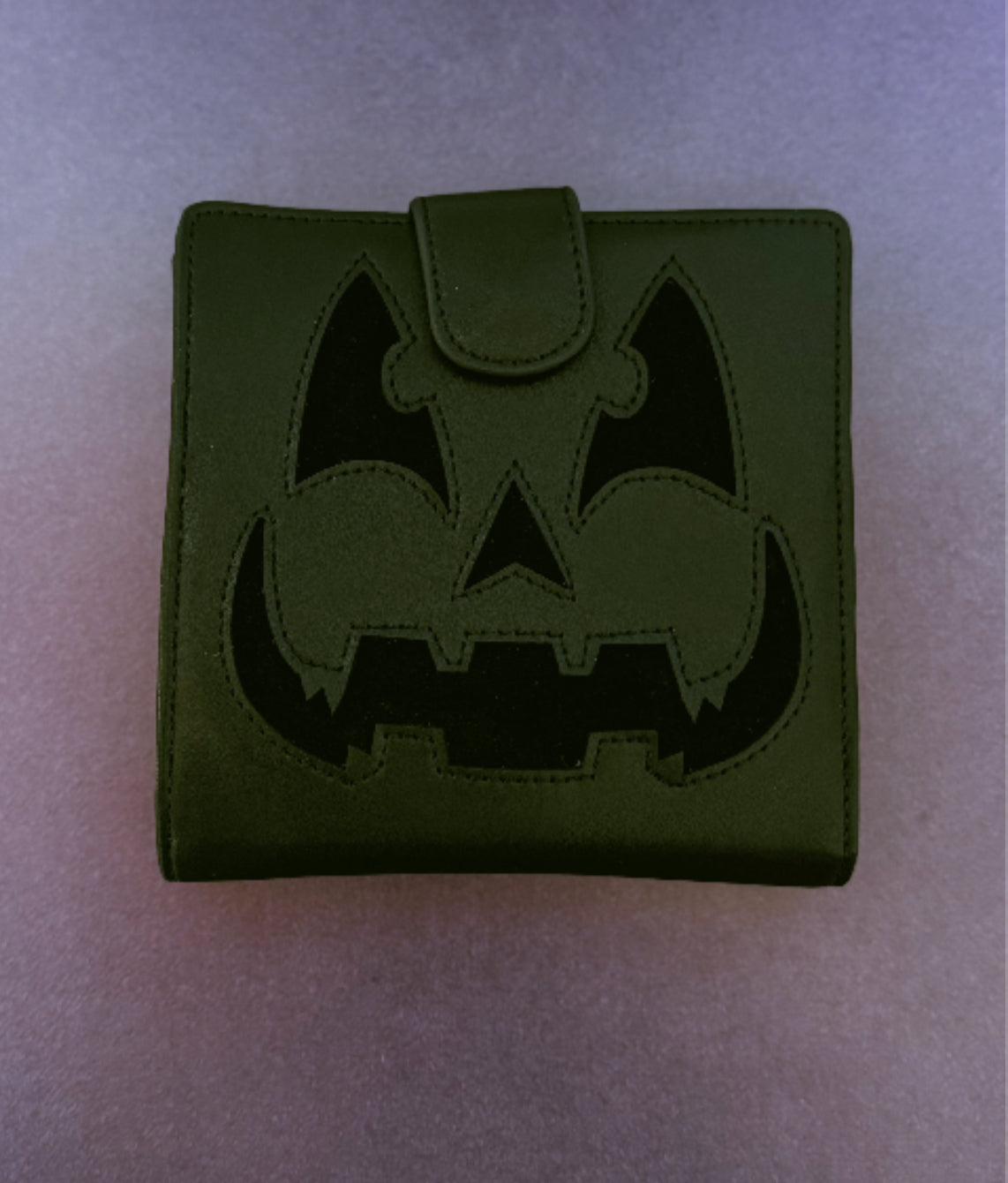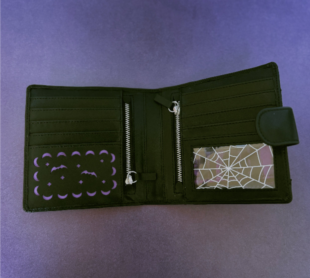 The interior is lined with a hand-drawn and printed fabric featuring purple and black stripes. The wallet features a convenient snap closure and includes eight card slots, an ID clot, two bill compartments, and two large zippered coin pocket, providing ample space to organize all your essentials.  Handmade with care and attention to detail, this one-of-a-kind wallet is the perfect Halloween-inspired accessory to elevate your style.