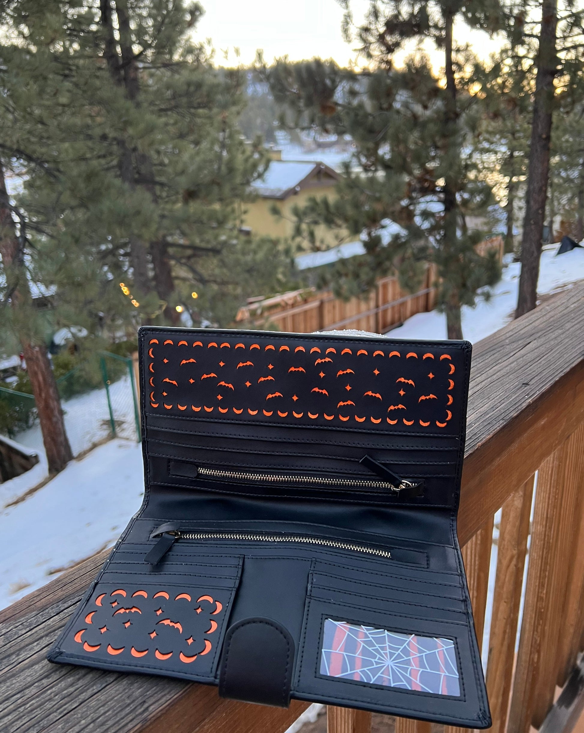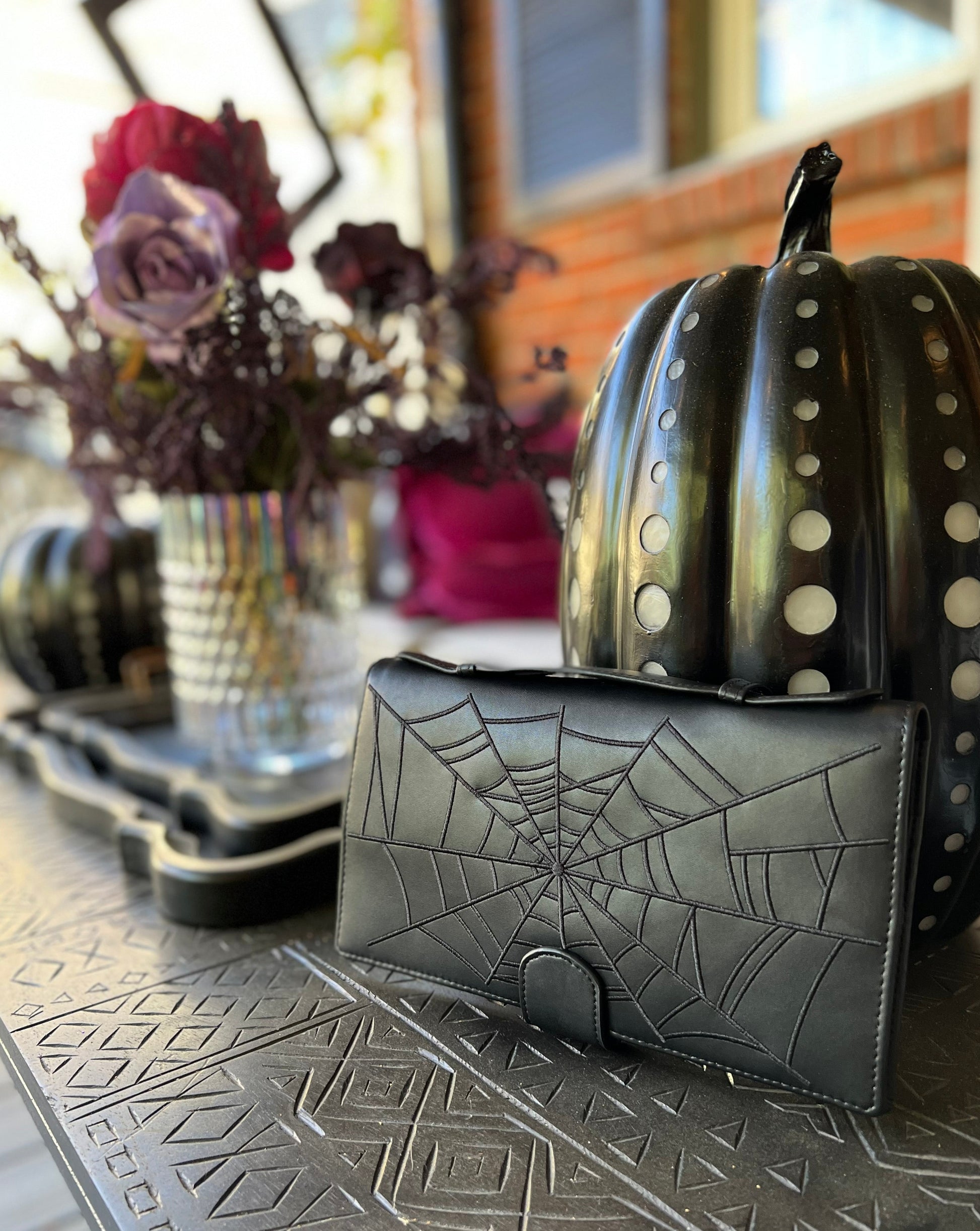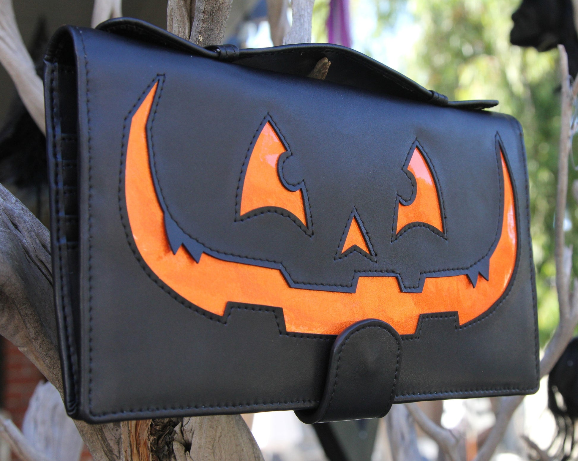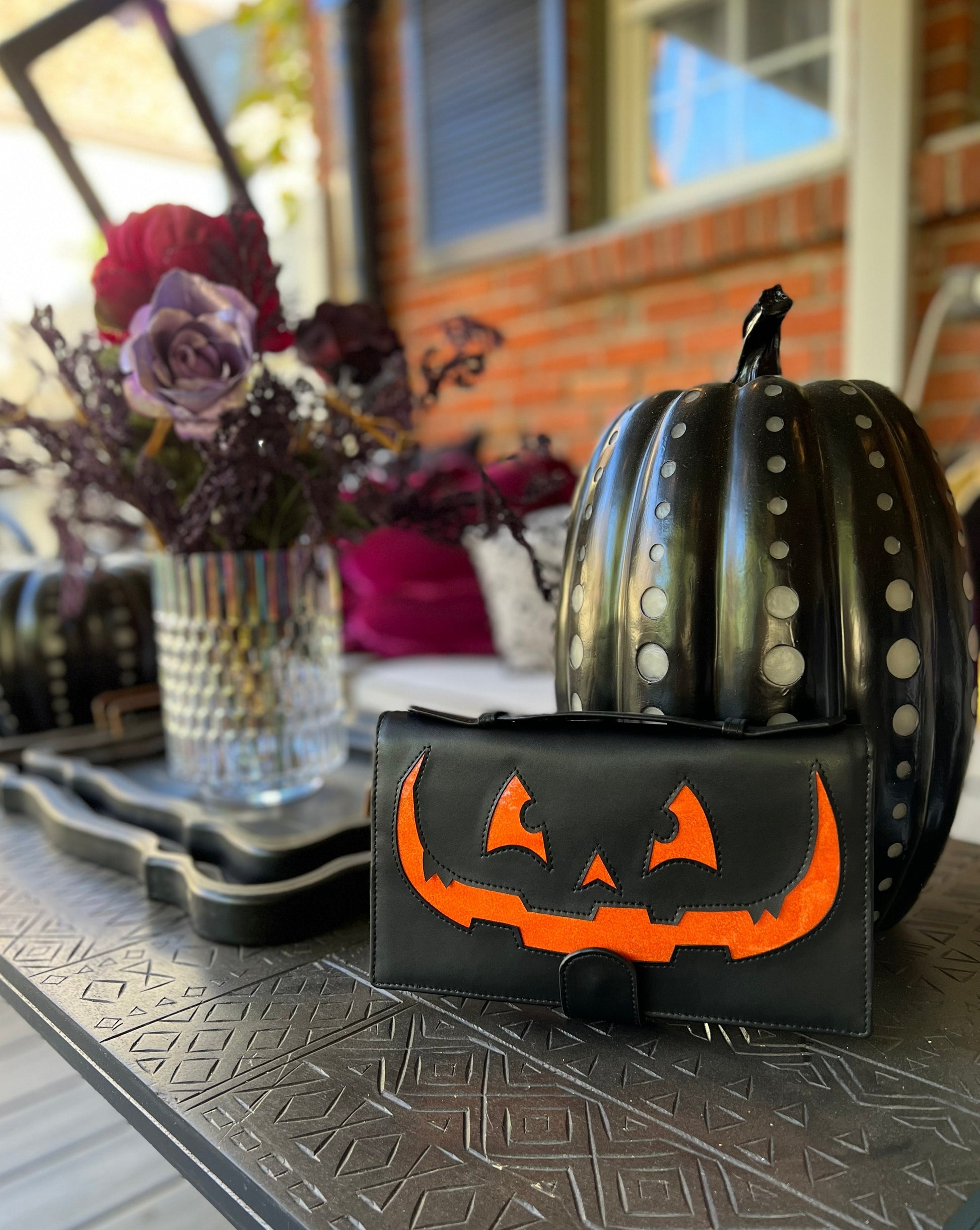 Get ready for Halloween with our "Punkin Clutch," the perfect accessory to add a touch of spookiness to any outfit. Made from high-quality materials, this clutch features a unique pumpkin design that's sure to make a statement. The spacious interior is lined with our hand drawn signature "October Magic" print and includes plenty of card slots to keep your things organized, while deep interior pockets are big enough to hold your phone, keys, and other essentials.  Measuring 6 inches in height and 9.75 inches in width, this clutch is the perfect size to carry your essentials while on-the-go. Perfect for Halloween parties, trick-or-treating, or any other spooky occasion, this handmade clutch is sure to be a conversation starter.