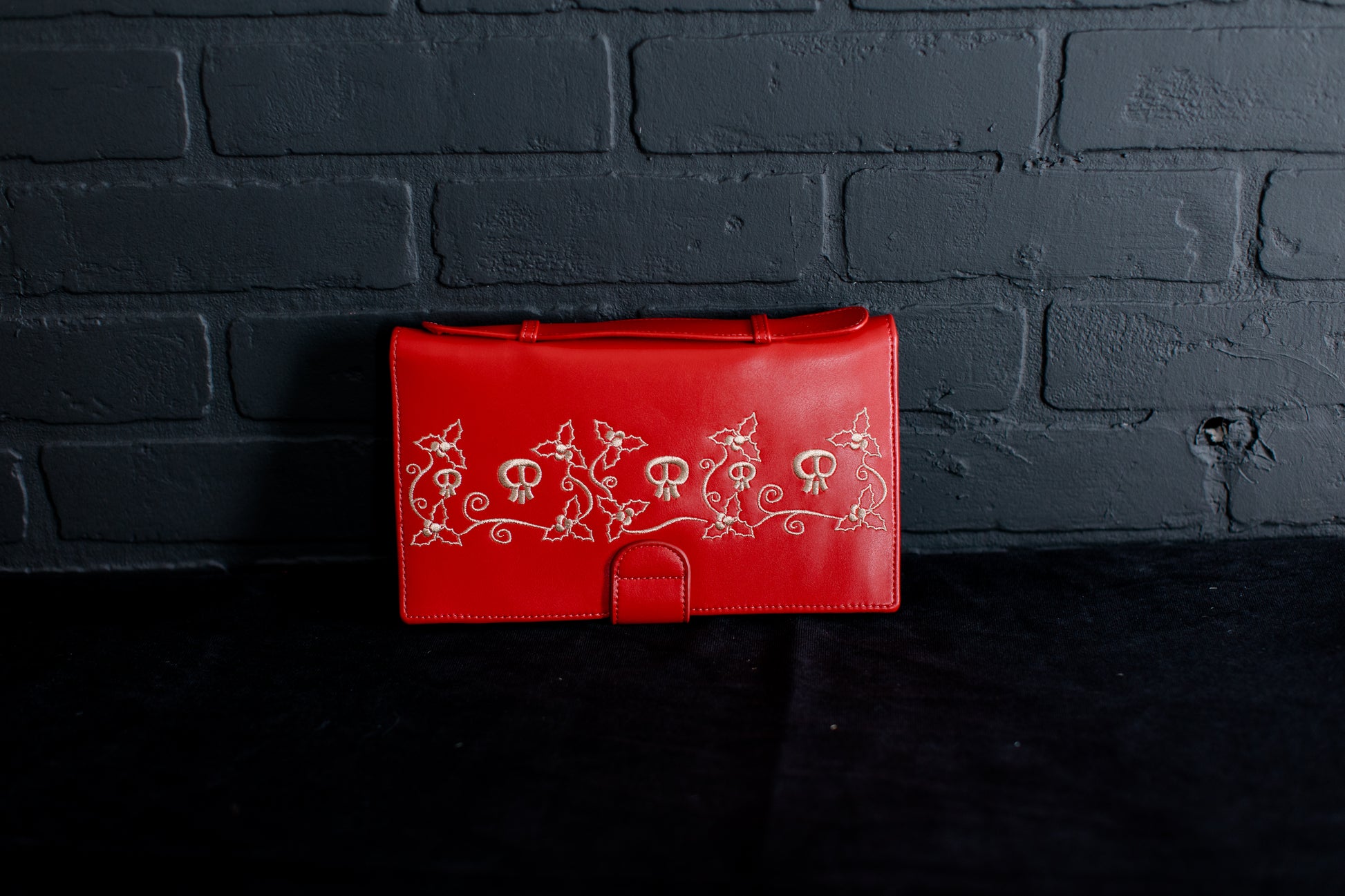 This clutch has unique designs on each side. It features a crinkled dark green jack-o-lantern face on one side that is sure to set the mood for the holidays. The other side has an elegant skull and holly berry pattern embroidered in gorgeous gold stitching.