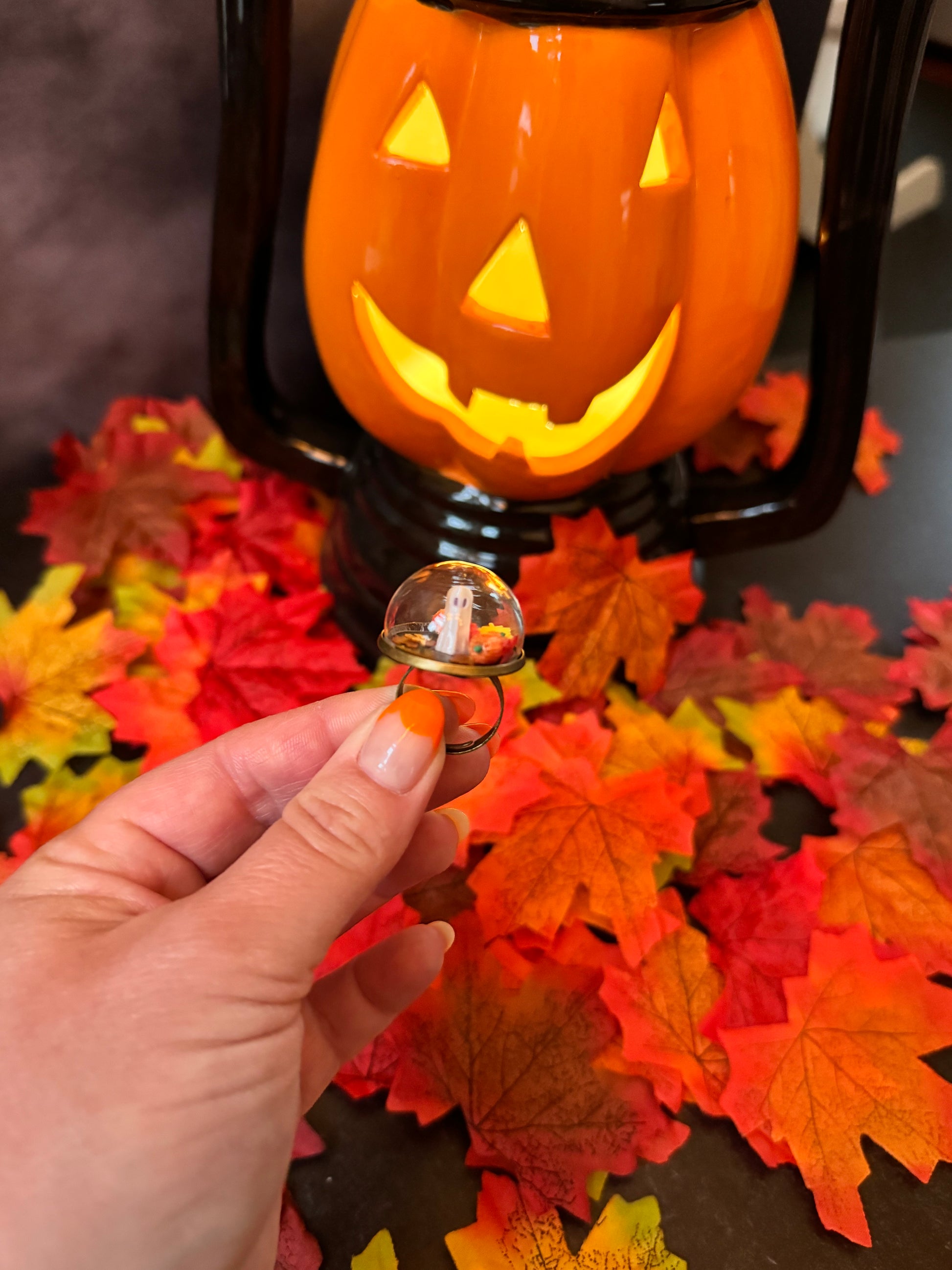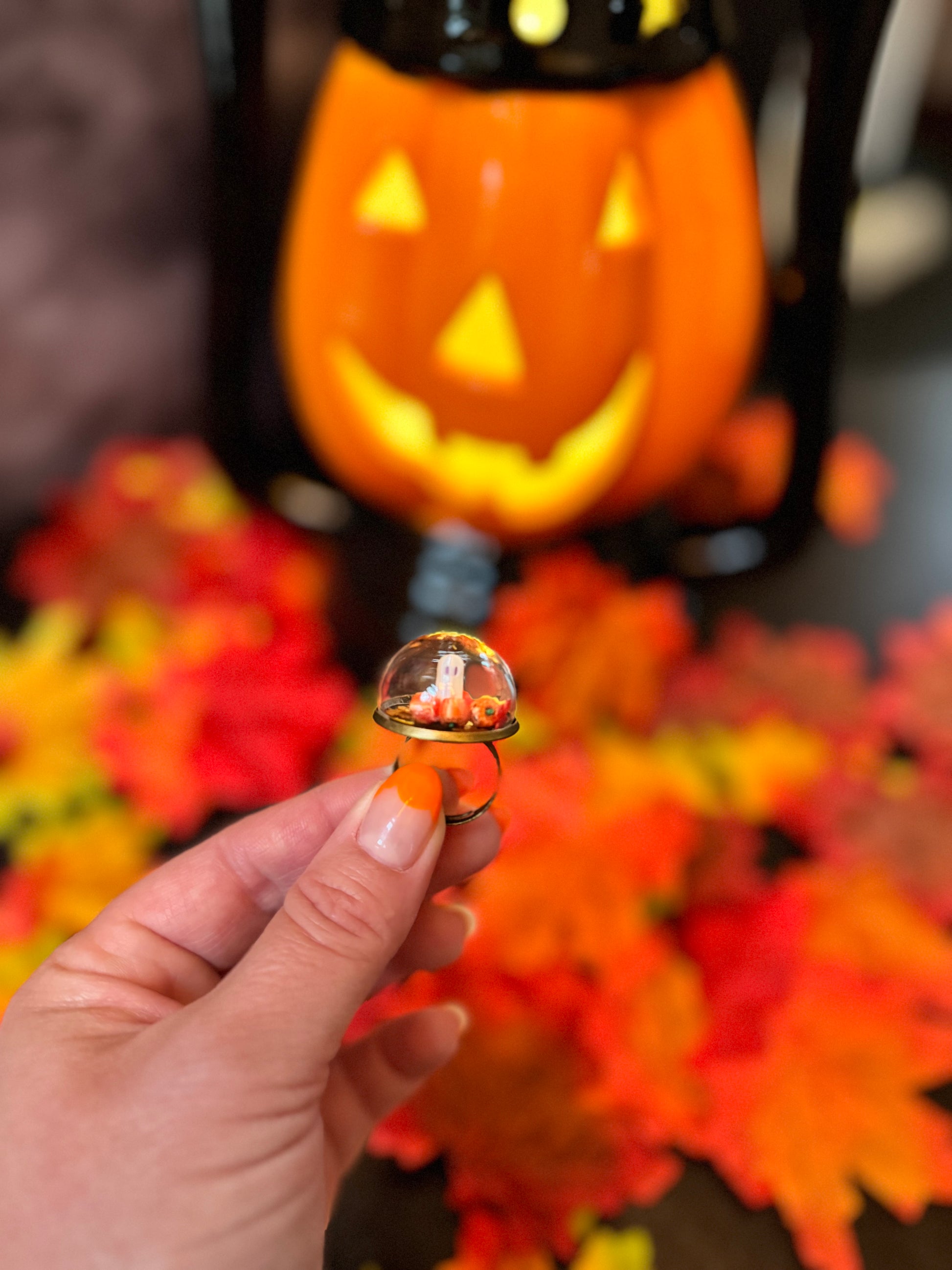 This whimsical Halloween ring is the perfect blend of spooky and sweet. It features a delicate glass dome encasing a tiny ghost surrounded by mini pumpkins and autumn leaves, all brought to life with intricate details. The ring’s charm is elevated by its autumnal color palette, perfect for anyone who wants to embrace the festive magic of the fall season. Whether you're dressing up for Halloween or simply want to showcase your love for the autumnal months, this ring is an enchanting addition to your jewelry collection.