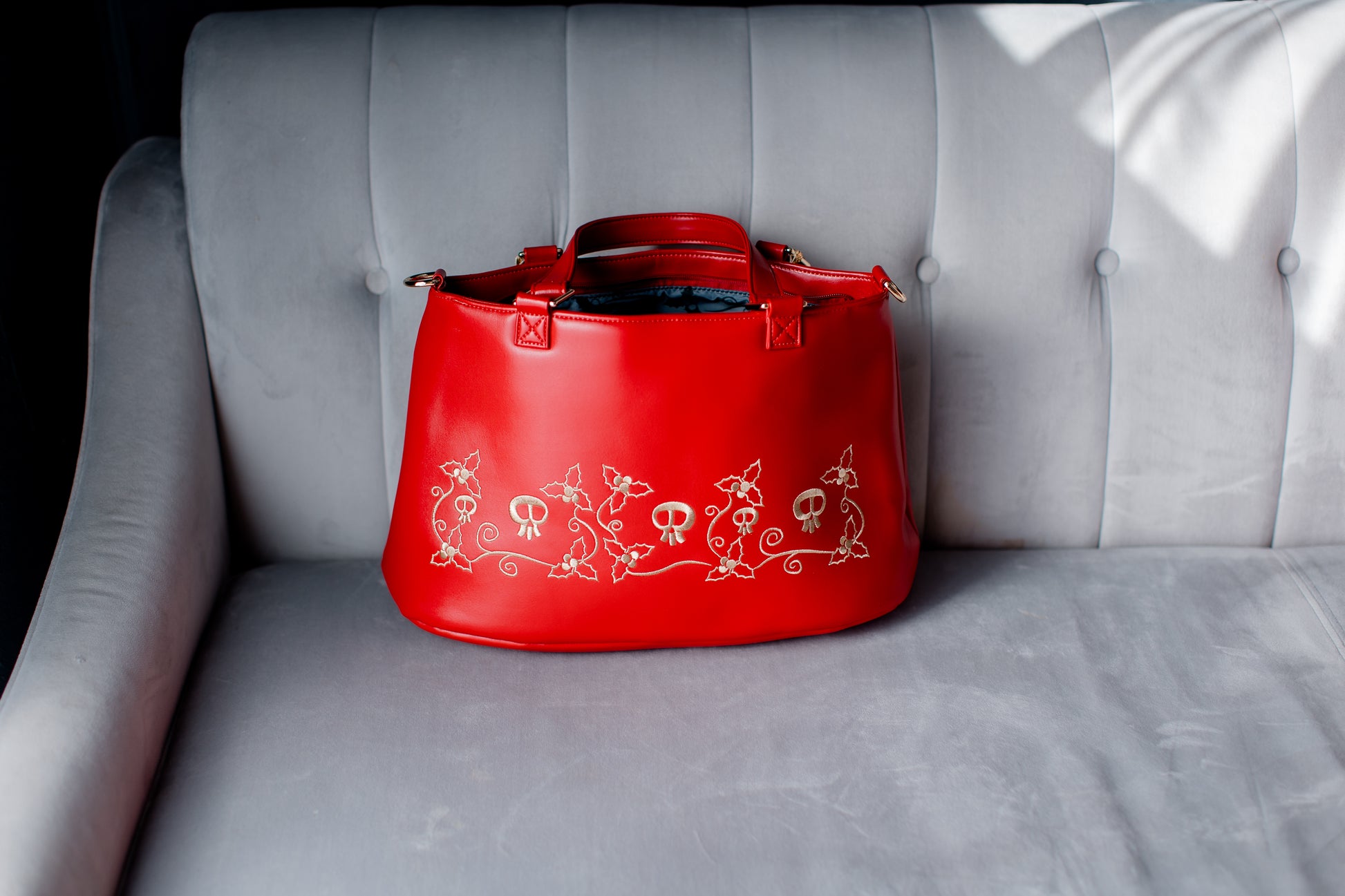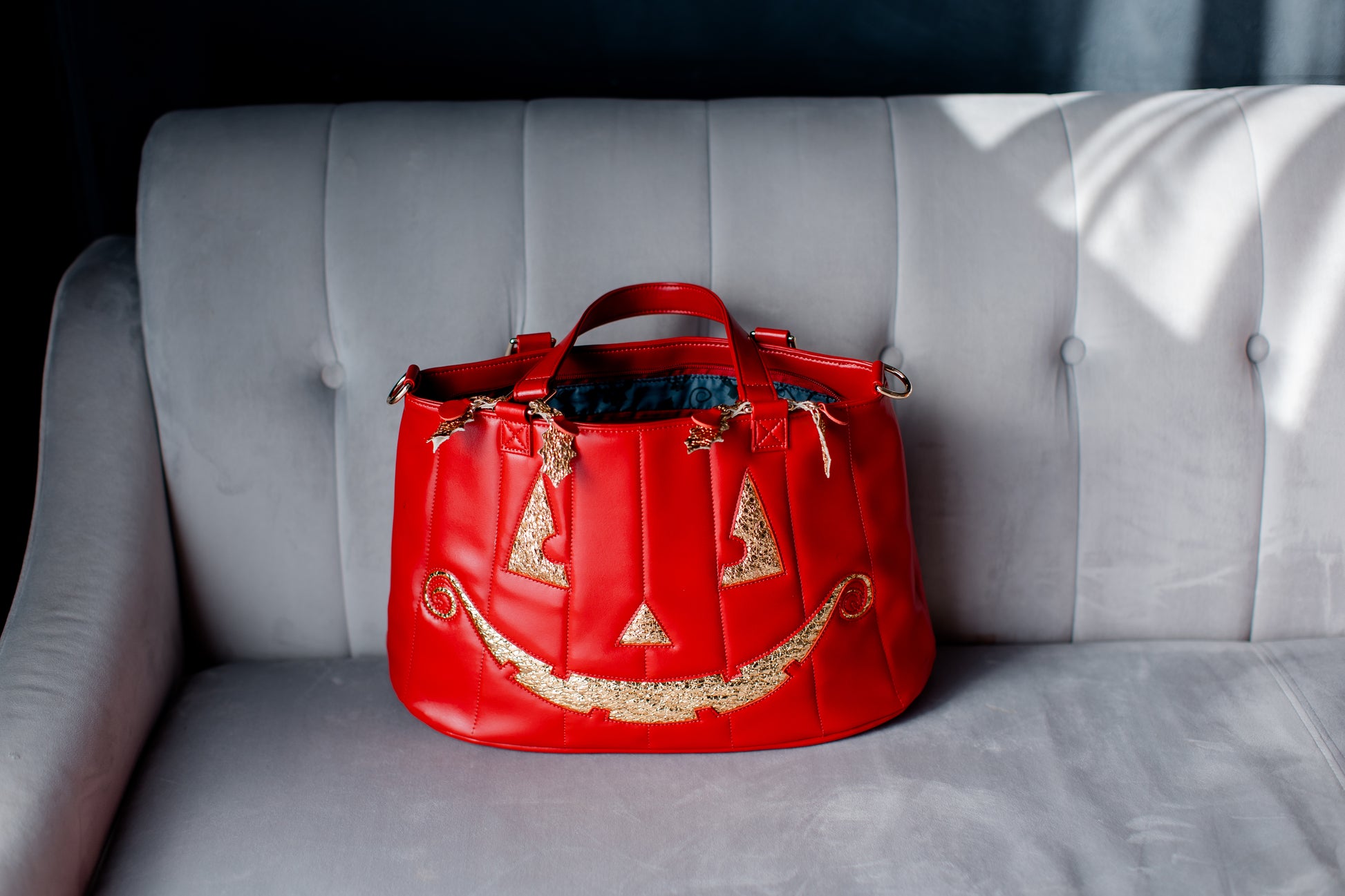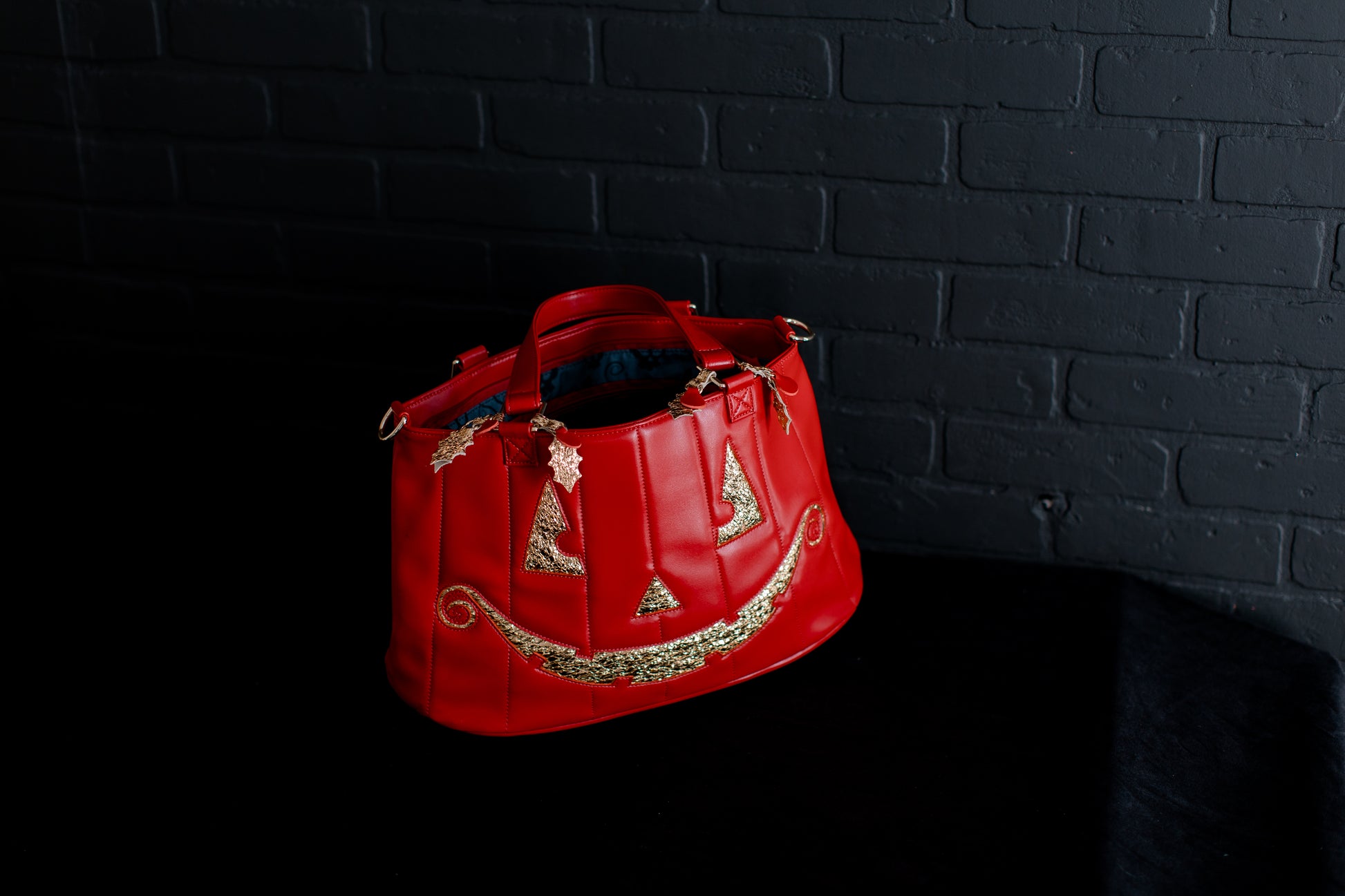 This purse has unique designs on each side. It features a jack-o-lantern face on one side that is sure to set the mood for your spooky holiday season. The other side has an elegant skull and holly berry pattern embroidered in gold stitching.
