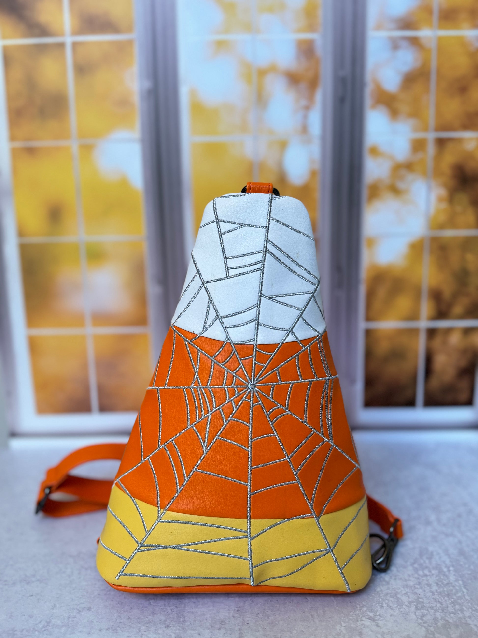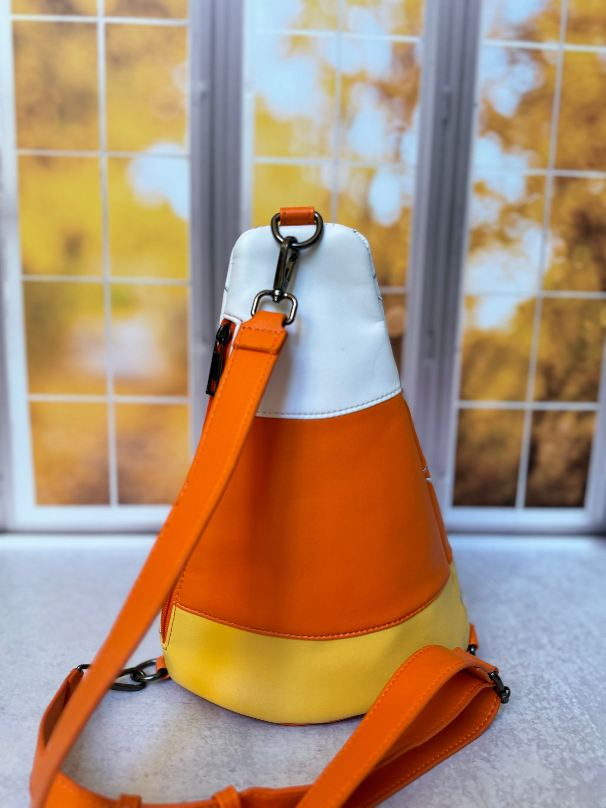 Introducing the enchanting Spooky Sweet Candy Corn Bag from The Punkin Shop! This versatile bag can be worn as a crossbody or backpack and is reversible, featuring a striking spiderweb design or a sleek, spiderweb-free exterior. With a built-in wallet, an additional interior pocket, and a tiny ghost friend in a secret pocket, it’s perfect for all your Halloween adventures. Comes with two straps and a dust bag for ultimate convenience. Elevate your spooky style with this magical accessory!