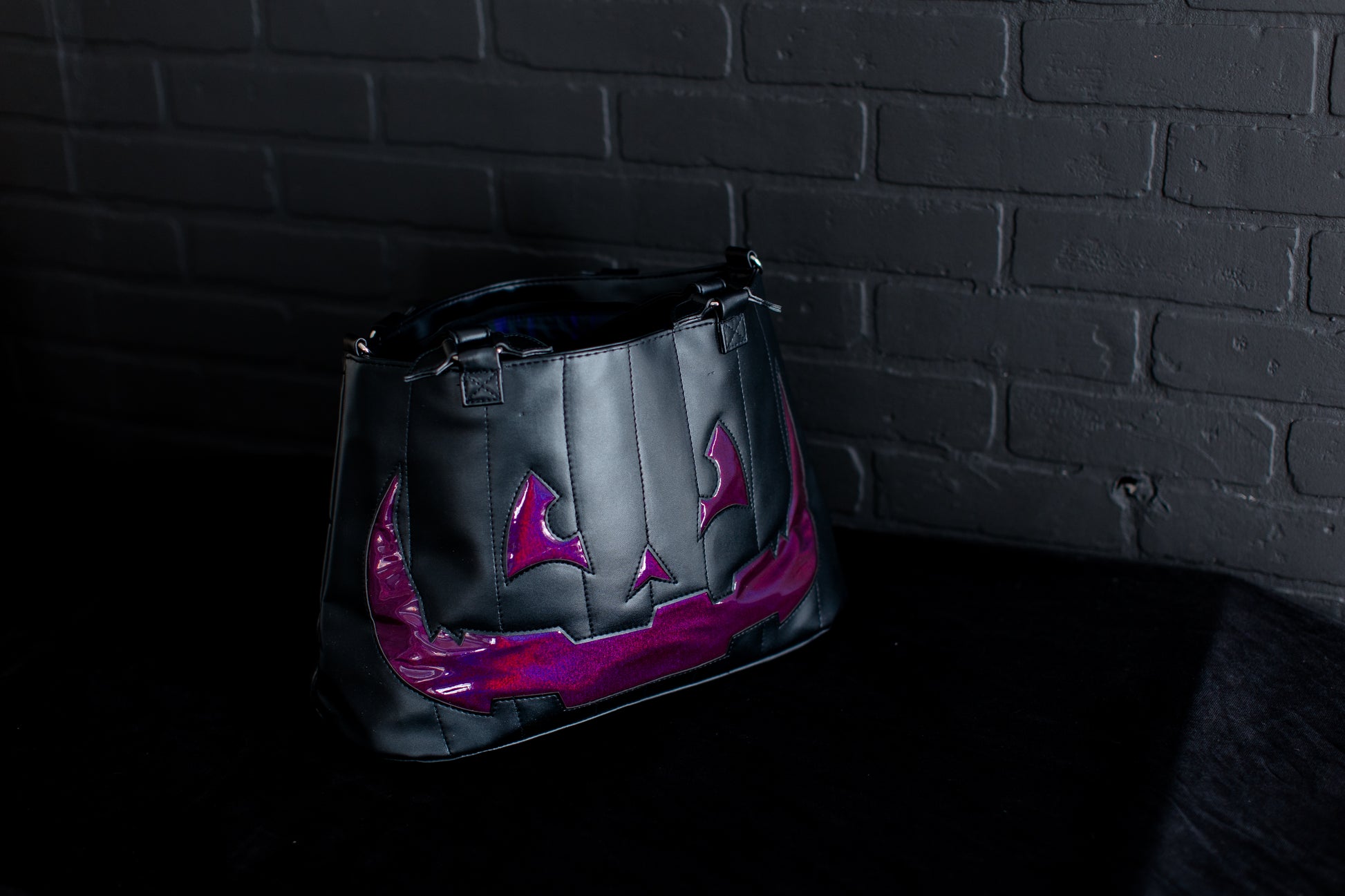 This purse has unique designs on each side. It features a purple holographic jack-o-lantern face on one side that is sure to set the mood for Halloween. The other side is covered in a spooky, elegant black spiderweb.