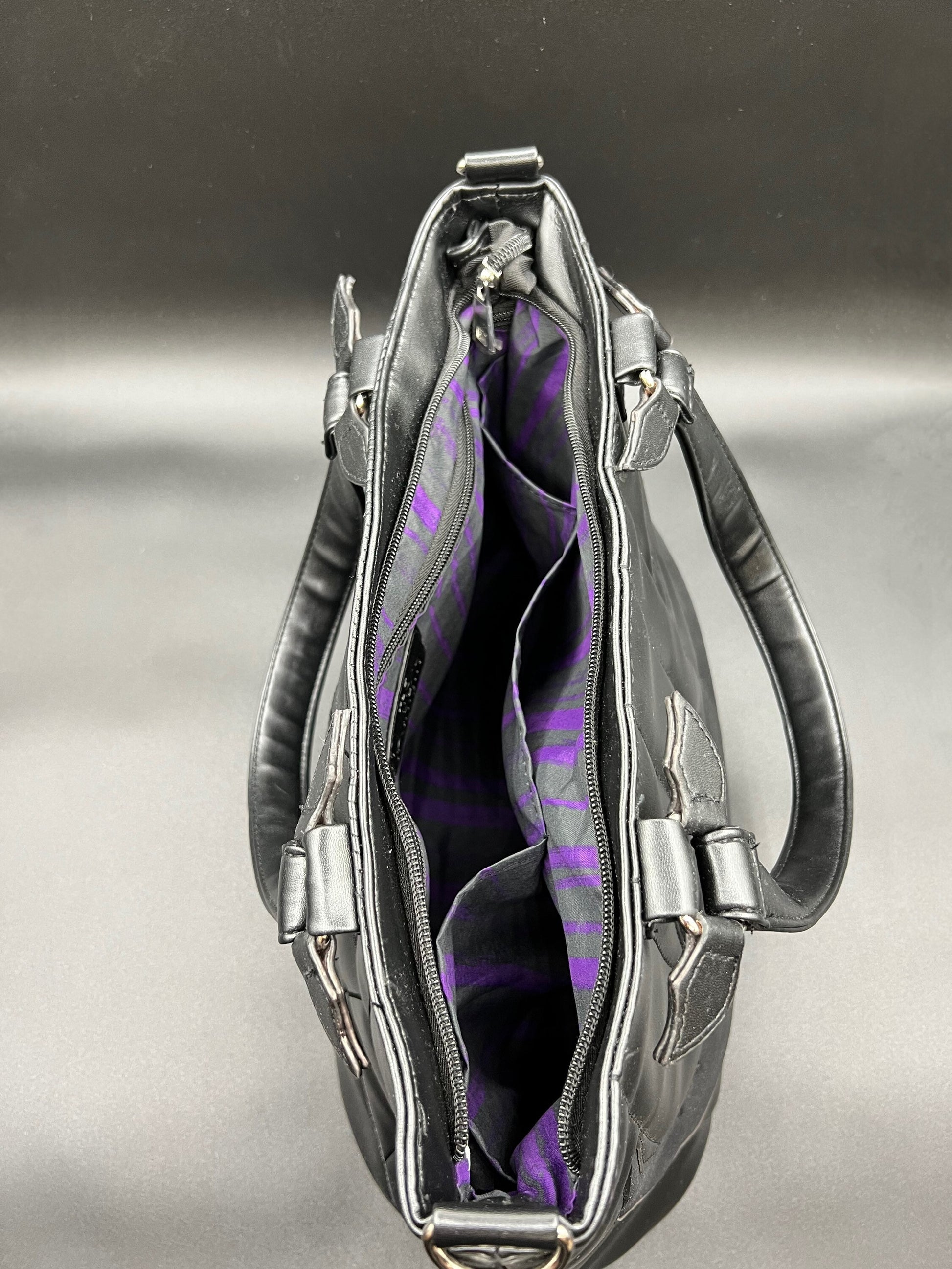 The inner liner was hand drawn and printed on fabric to ensure every inch of this purse was beautifully spooky. Inside is purple and black stripes.